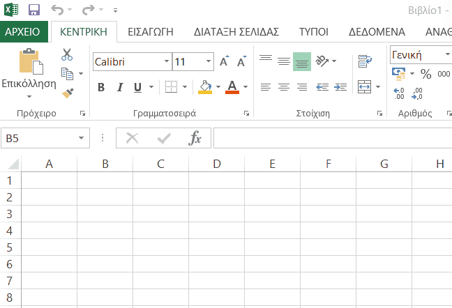 Στην παραπάνω εικόνα απεικονίζεται το περιβάλλον εργασίας του Excel. Στο πάνω μέρος της εικόνας διακρίνουμε την γραμμή τίτλου, όπου εμφανίζεται το όνομα του προγράμματος (Microsoft Excel) και το όνομα του αρχείου ή βιβλίου εργασίας (Βιβλίο1). Κάτω από την γραμμή τίτλου υπάρχει η γραμμή μενού (Αρχείο, ..., Βοήθεια), η βασική γραμμή εργαλείων και η γραμμή εργαλείων μορφοποίησης. Η γραμμή τύπων είναι η σπουδαιότερη γραμμή εργαλείων, γιατί μας δείχνει την διεύθυνση του κελιού που βρισκόμαστε αλλά και το περιεχόμενο του. Κάτω από την γραμμή τύπων υπάρχει η περιοχή, όπου μπορούμε να εισάγουμε τα δεδομένα μας. Η περιοχή αυτή χωρίζεται σε γραμμές και στήλες και αποτελεί ένα υπολογιστικό φύλλο ή φύλλο εργασίας. Η κάθε γραμμή παίρνει το όνομά της από τον αριθμό που βρίσκεται στα αριστερά της (π.χ. 1, 2, 3, 4, 5, 6 ...) ενώ η κάθε στήλη παίρνει το όνομά της από το αγγλικό κεφαλαίο γράμμα που βρίσκεται από πάνω της (π.χ. A, B, C, D, E, F, ...). Τα γράµµατα των στηλών και οι αριθµοί των γραµµών ονοµάζονται ετικέτες και απεικονίζονται µε γκρίζο χρώµα. Η τομή μιας γραμμής και μιας στήλης δημιουργεί ένα πλαίσιο, που ονομάζεται κελί. Το κάθε κελί έχει µία και μοναδική διεύθυνση, η οποία σχηµατίζεται από το όνοµα της στήλης και τον αριθµό της γραµµής που βρίσκεται (π.χ. A1, B3, C12, F8, ...).