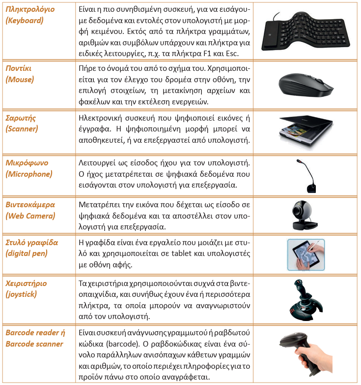 Για την εισαγωγή των δεδομένων χρησιμοποιούμε διάφορες συσκευές, που ονομάζονται συσκευές εισόδου.