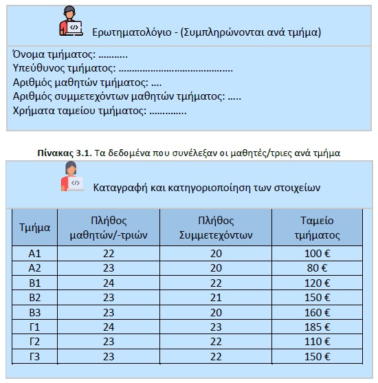 - Οργανώνουμε πληροφορίες σε πίνακες (π.χ., Τμήμα, Πλήθος Μαθητών, Κόστος Μεταφοράς).