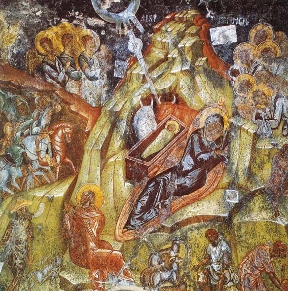 | «Η Γέννηση του Χριστού» ἐργο Θεοφάνη του Κρητός, 1545-46 Τοιχογραφία Ι.Μ. Σταυρονικήτα Άγιον Όρος, (φωτ. Μανώλη Χατζηδάκη) |