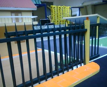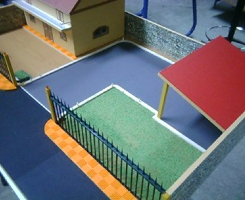 | 06. Προσθήκη γρασιδιού και εξωτερικών κάγκελων οικοπέδου Το γκαζόν που έχει τοποθετηθεί είναι σε μορφή σκόνης και έχει τοποθετηθεί επάνω σε ένα στρώμα κόλλας. Επίσης έχει δημιουργηθεί κι ένα καπάκι με γκαζόν για να καλύψει το μηχανισμό κίνησης της πόρτας. Τα κάγκελα έχουν φτιαχτεί με ξυλάκια για καλαμάκια και ξύλο μπαλσά στο επάνω μέρος τους (ως το οριζόντιο σίδερο που τα κρατάει. Τα "καγκελα" έχουν βαφτεί με μπογιά Δημιουργός: Μαθητές του 1ου ΤΕΕ Χαλανδρίου, Σχολική χρονιά 2005-2006 |