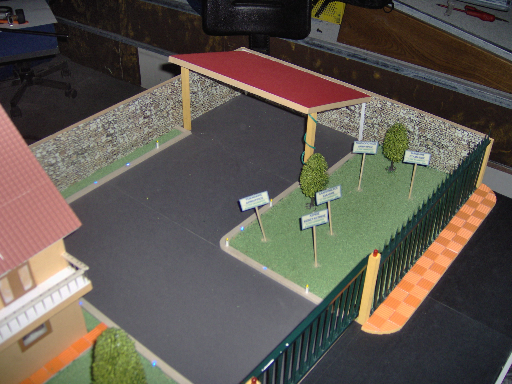 | 02. Προσθήκη δρόμου και μοτέρ για την κίνηση της γκαραζόπορτας Εδώ έχουν φτιαχτεί πεζοδρόμια, ο τοίχο της μάντρας έχει ντυθεί με χαρτί δίνοντας την αίσθηση του πέτρινου μαντρότοιχου. Στα άκρα του δρόμου βρίσκεται κομμάτι ξύλου μπαλσά. Δημιουργός: Μαθητές του 1ου ΤΕΕ Χαλανδρίου, Σχολική χρονιά 2005-2006 |